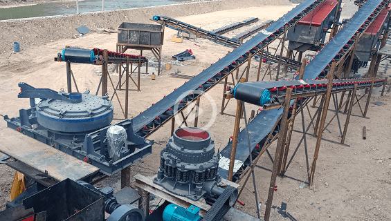 This cobblestone sand production line contains a jaw crusher, a cone crusher, a sand maker and two vibrating screen and other auxiliary equipment. The production line can crush large stone into 1/2, 3/4 gravel, G1, G2, sand, dust, etc with less power cons